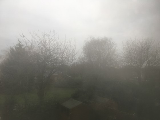 Flat light takes the edge off the world, diffused further by the condensation painted window.